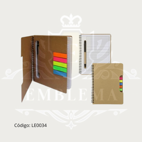 Libreta ecológica que contiene: 1 lapicero ecológico, 5 post it traslúcidos pequeños de diferentes colores y 70 hojas blancas rayadas.