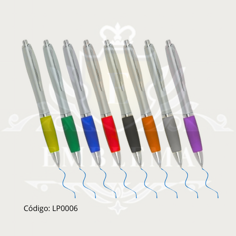 Lapicero plástico retráctil de color plateado mate, con goma antideslizante de color traslúcido.